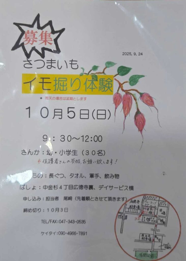 2025-10-02 お知らせ 日時: 10月5日(日) 9:30〜12:00 ※雨天の場合は翌日に延期開催場所: 中金杉4丁目広徳裏、デイサービス横対象者: 幼・小学生(先着30名)※保護者の参加をお願いします持ち物: 長靴、タオル、軍手、飲み物締め切り: 10月3日お申込み: 担当者 尾崎 ※締め切りました TEL/FAX: 047-343-0535 ケイタイ:090-4966-7891